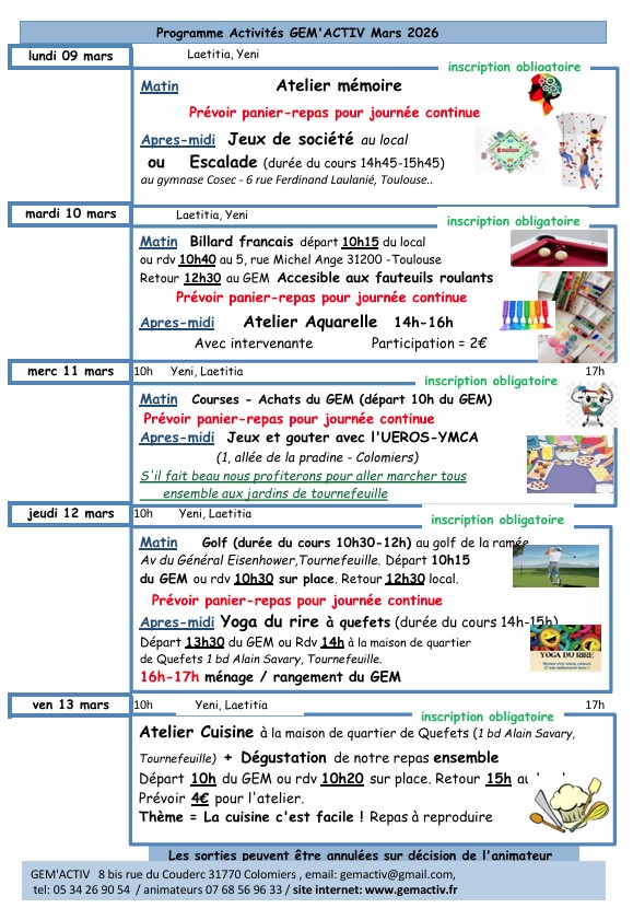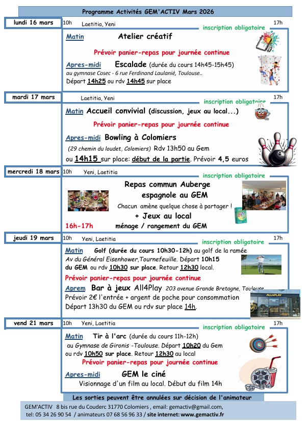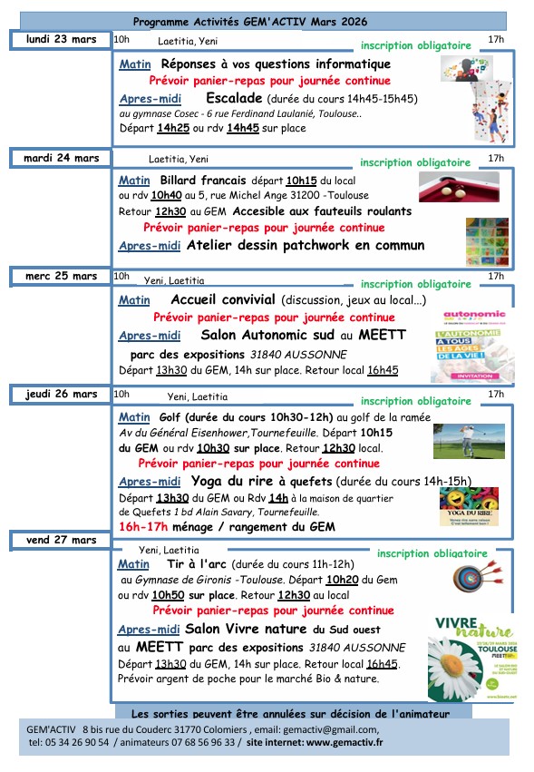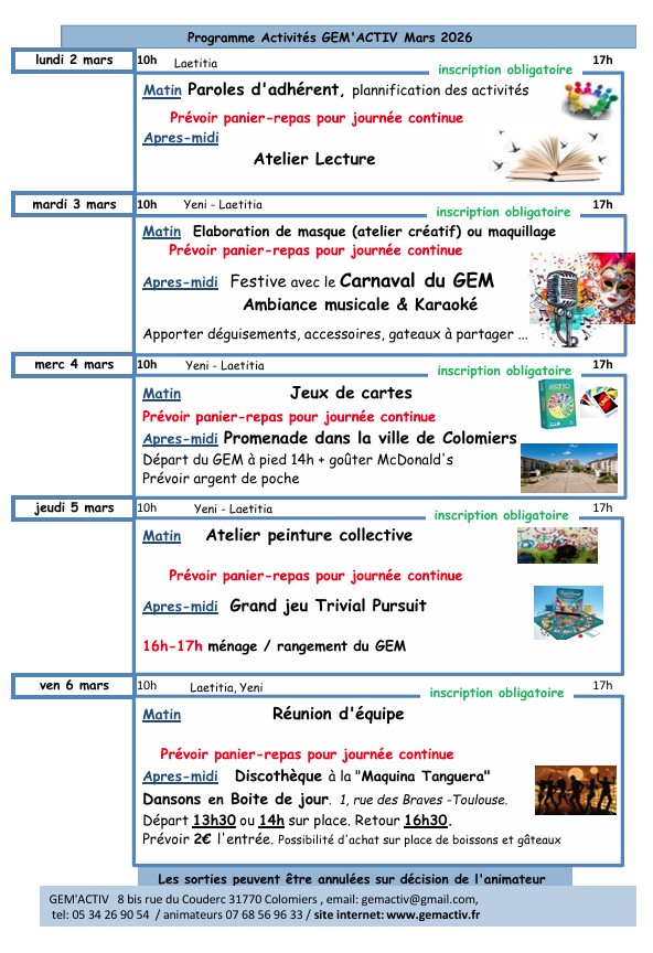 Voici ci-dessous, le programme d’activités du mois de mars 2026:
